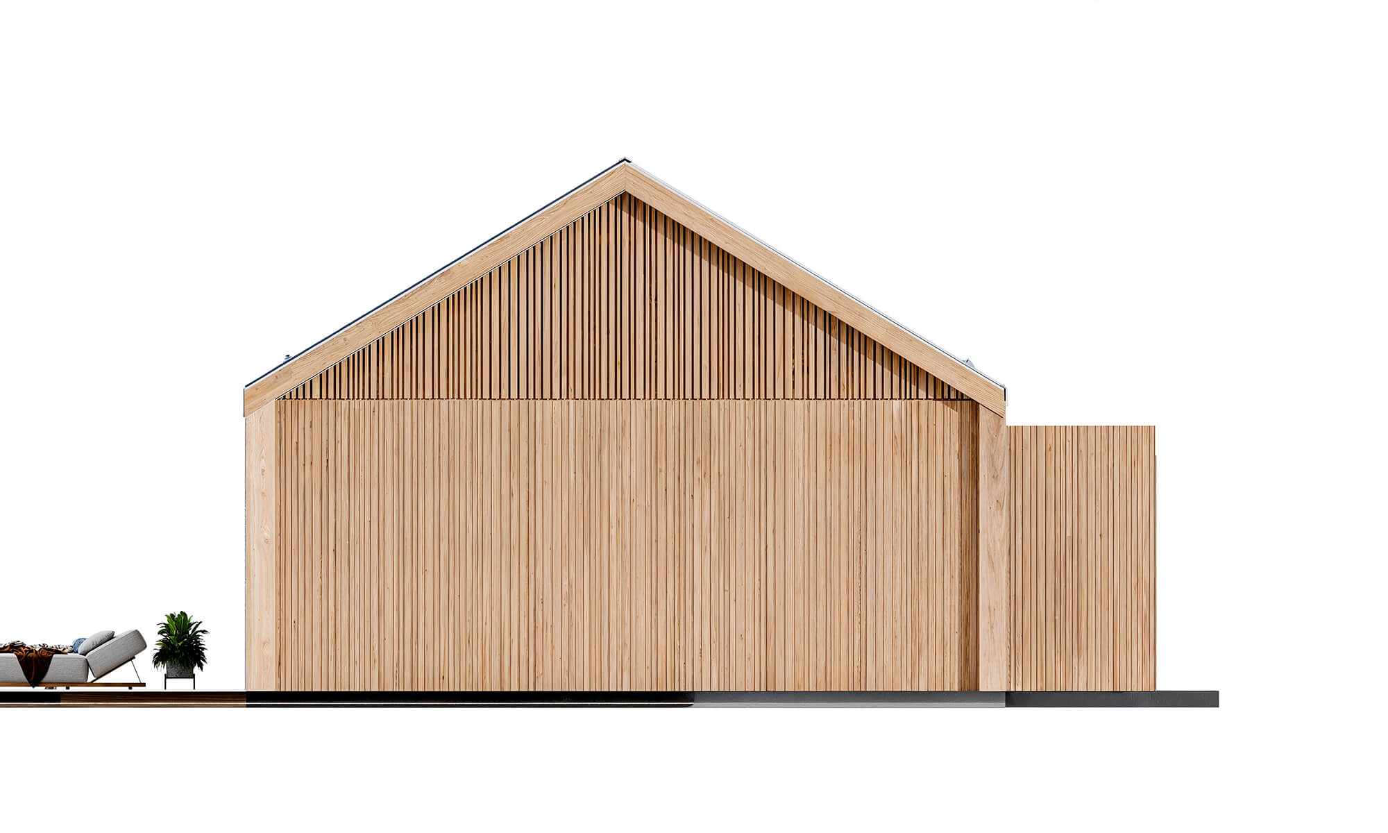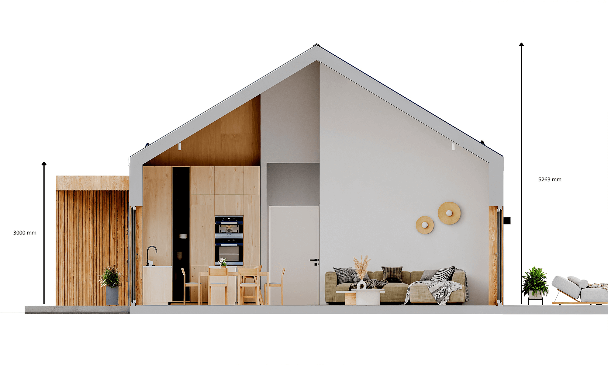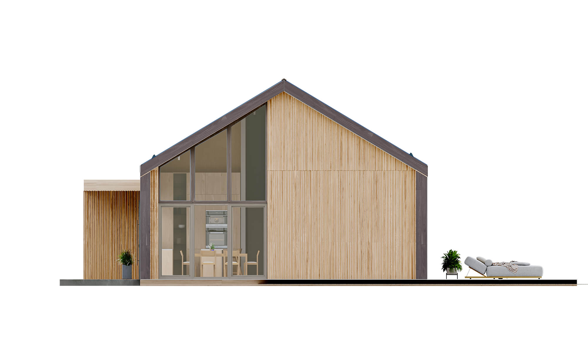 Projekt ten to domy szkieletowe całoroczne. Konstrukcja jest trwała, ciepła i długowieczna – idealna do zamieszkania przez cały rok jako domy całoroczne modułowe.