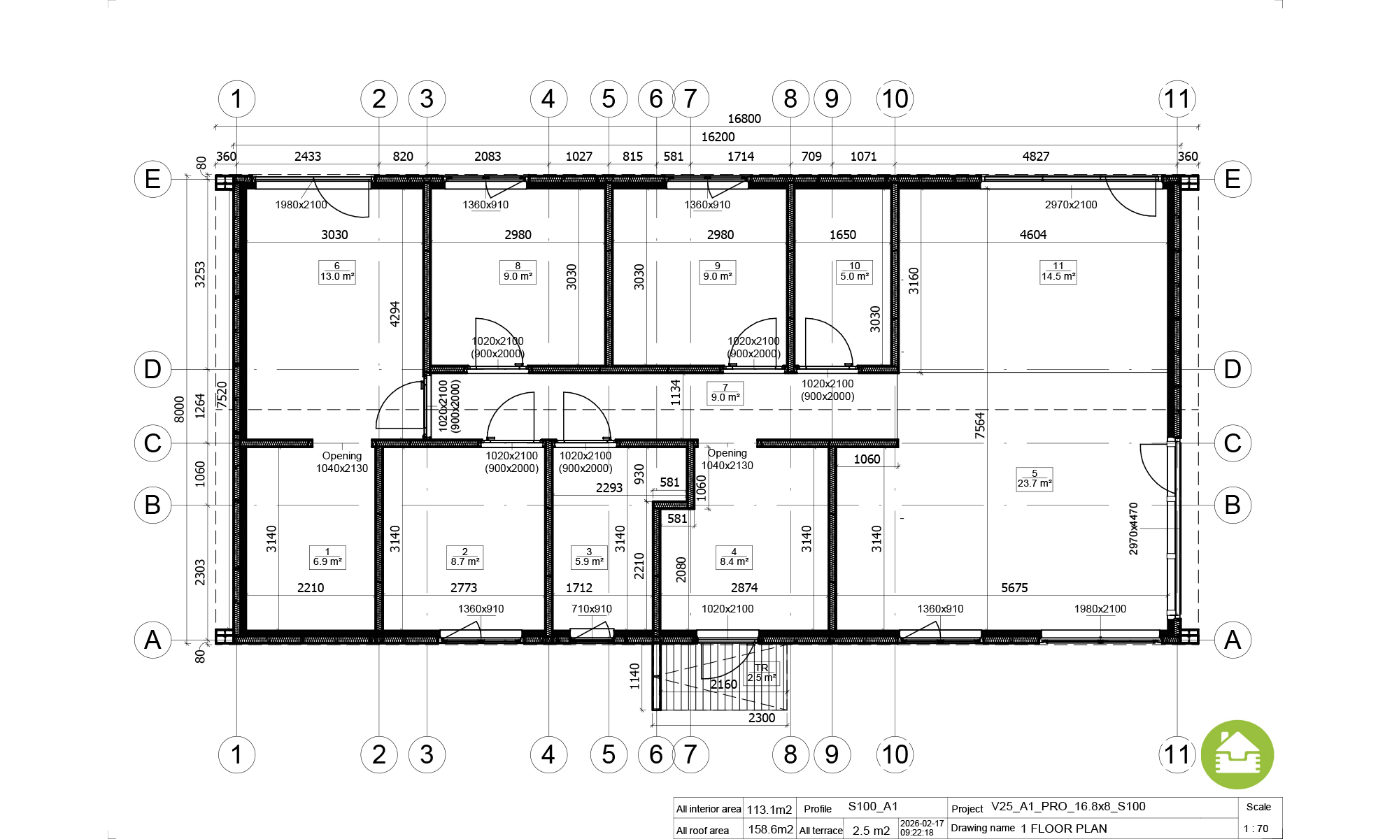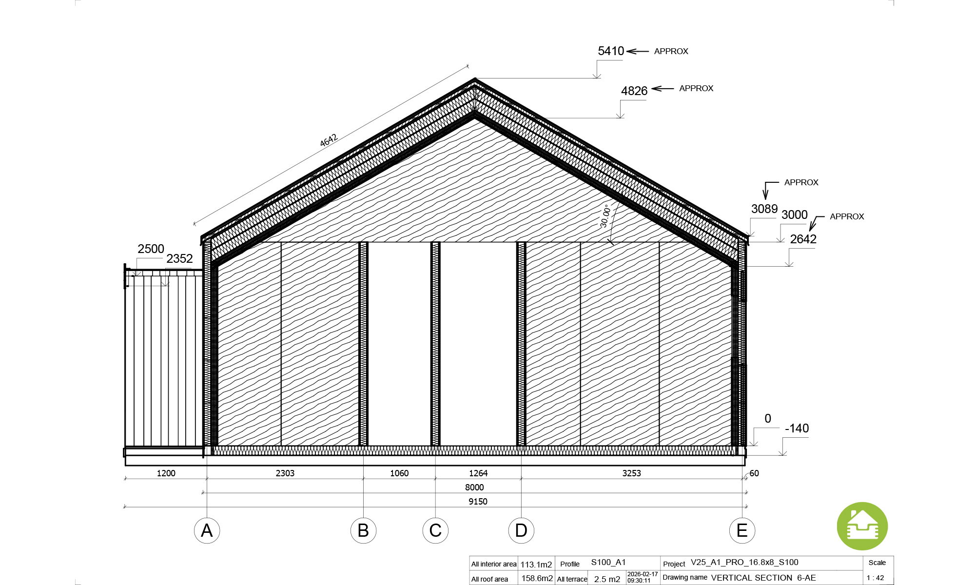 Powierzchnia użytkowa: 113 m² • Pokoje: 5 • Łazienki + toalety: 2 • Dodatkowe pomieszczenie: magazynek • Wymiary bryły: 17 × 8 m • Kąt dachu: 30°