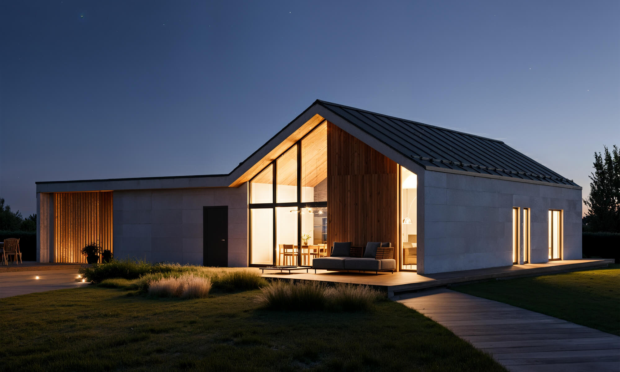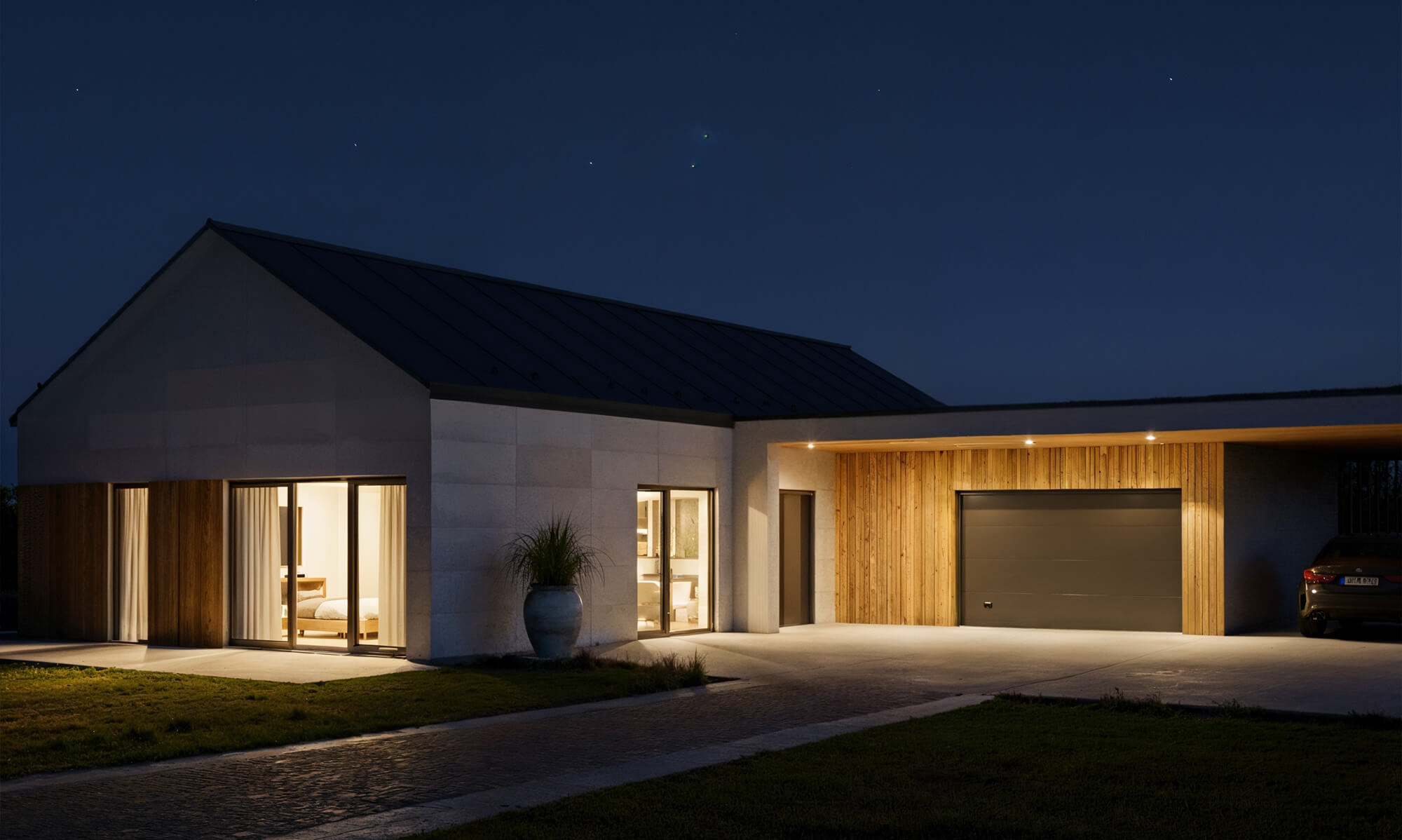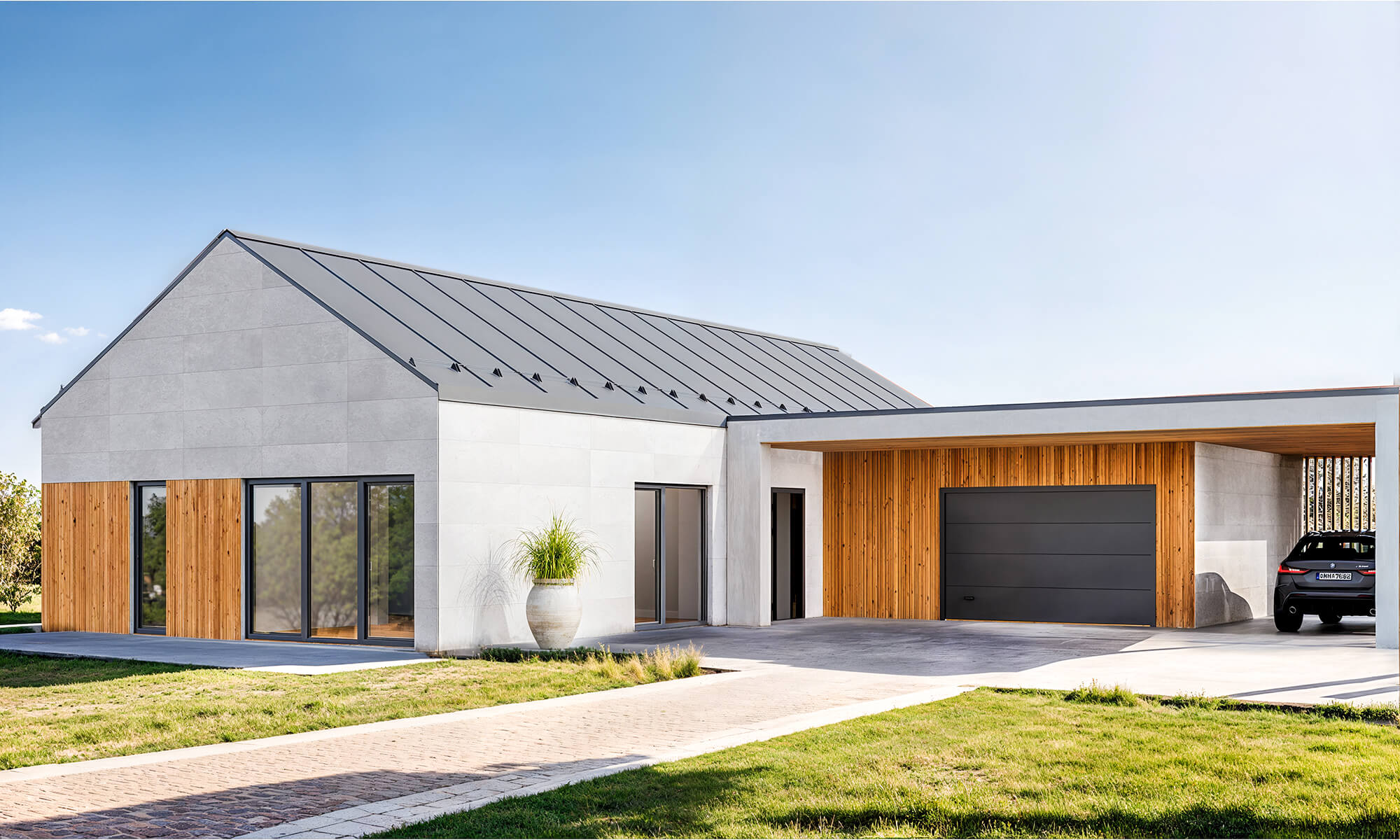 Połączenie fakturowanego betonu z naturalnym drewnem nadaje elegancji i trwałości, a nowoczesna bryła sprawia, że dom zachwyca prostotą i designem.