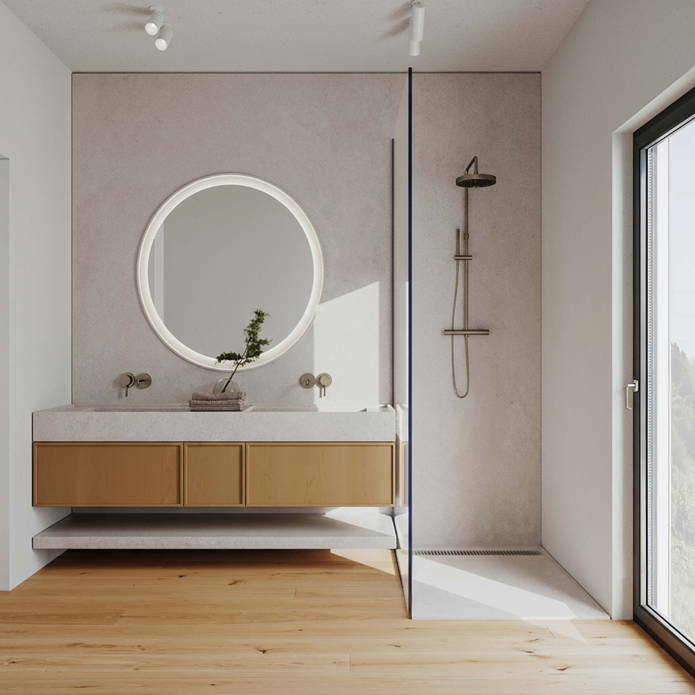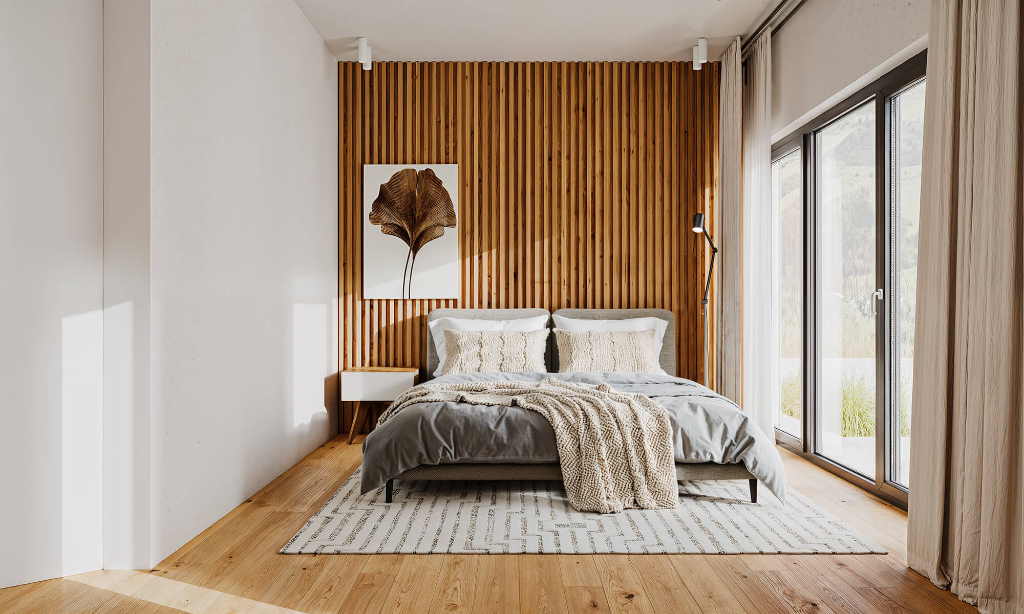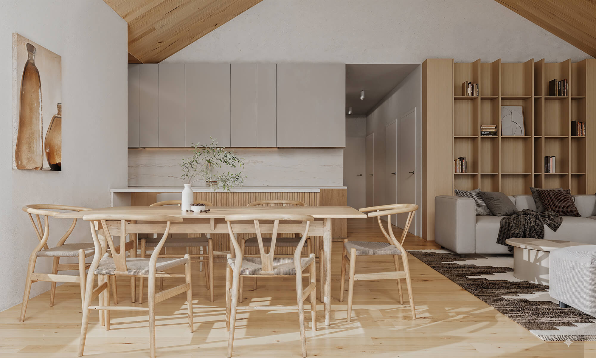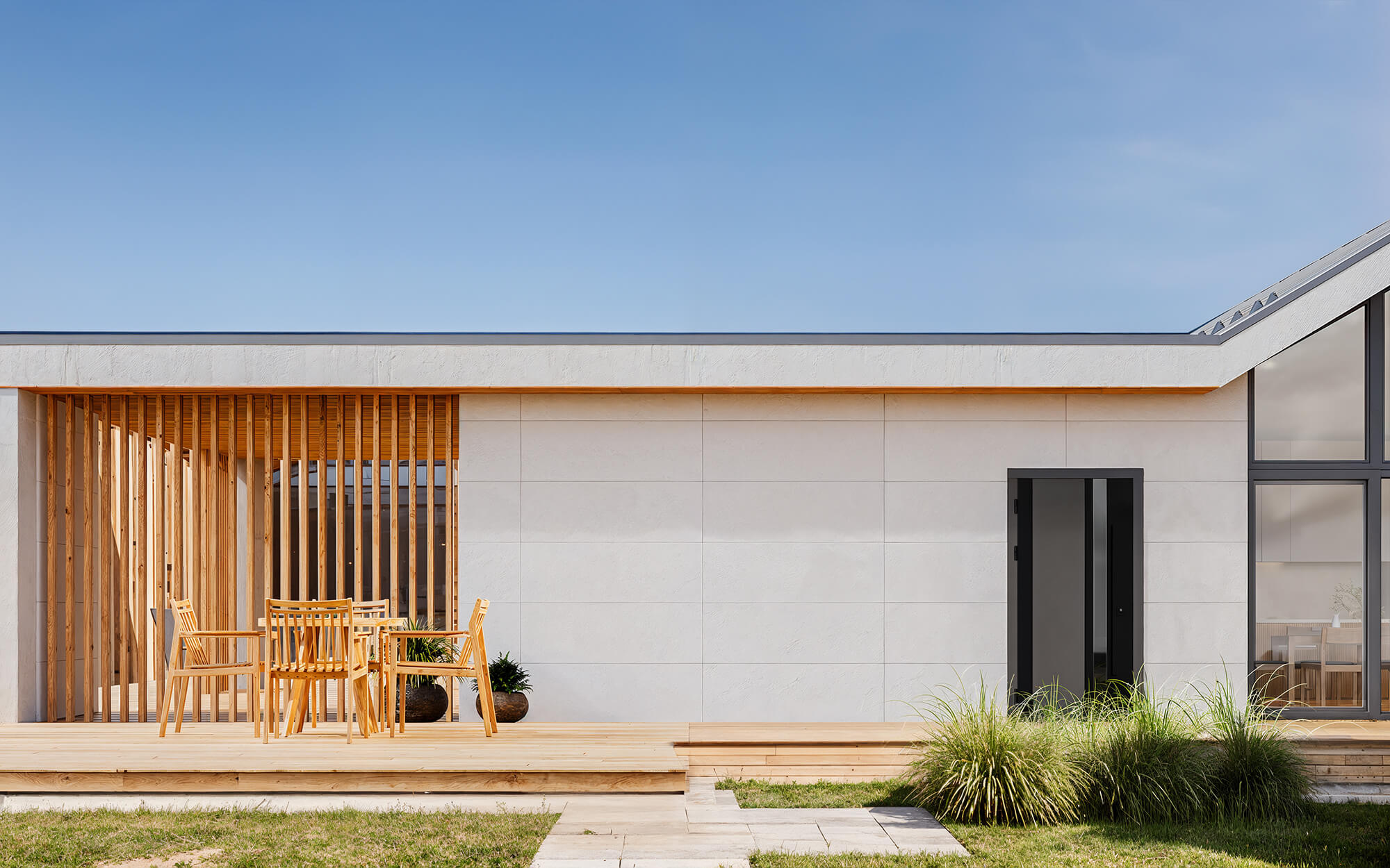 Połączenie fakturowanego betonu z naturalnym drewnem nadaje elegancji i trwałości, a nowoczesna bryła sprawia, że dom zachwyca prostotą i designem.