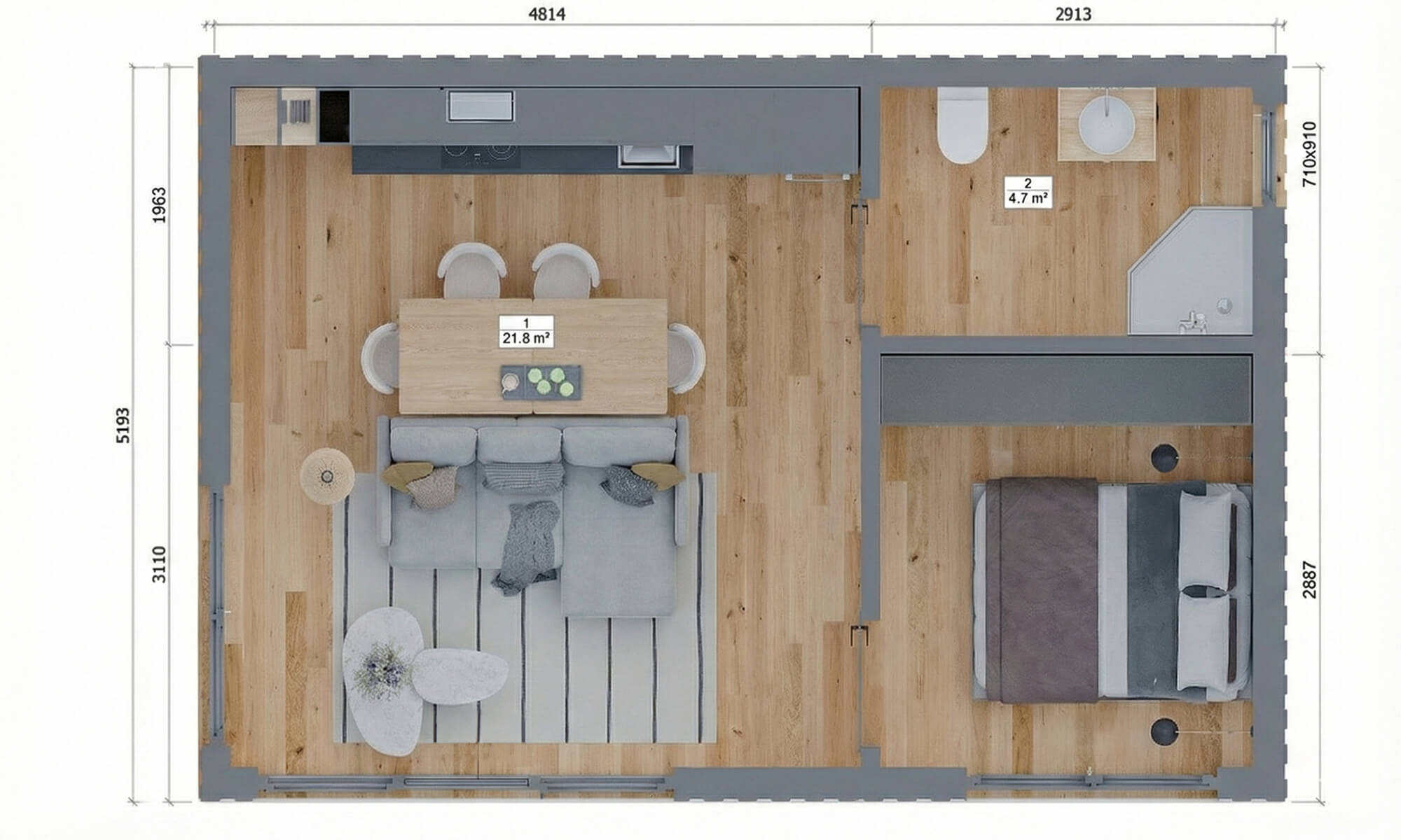 Odkryj nowoczesny dom modułowy, który łączy praktyczność z ekoświadomością. Model V15_A1 to idealne rozwiązanie dla osób szukających funkcjonalnego domu o powierzchni 34 m² z szybkim montażem i doskonałą izolacją termiczną.