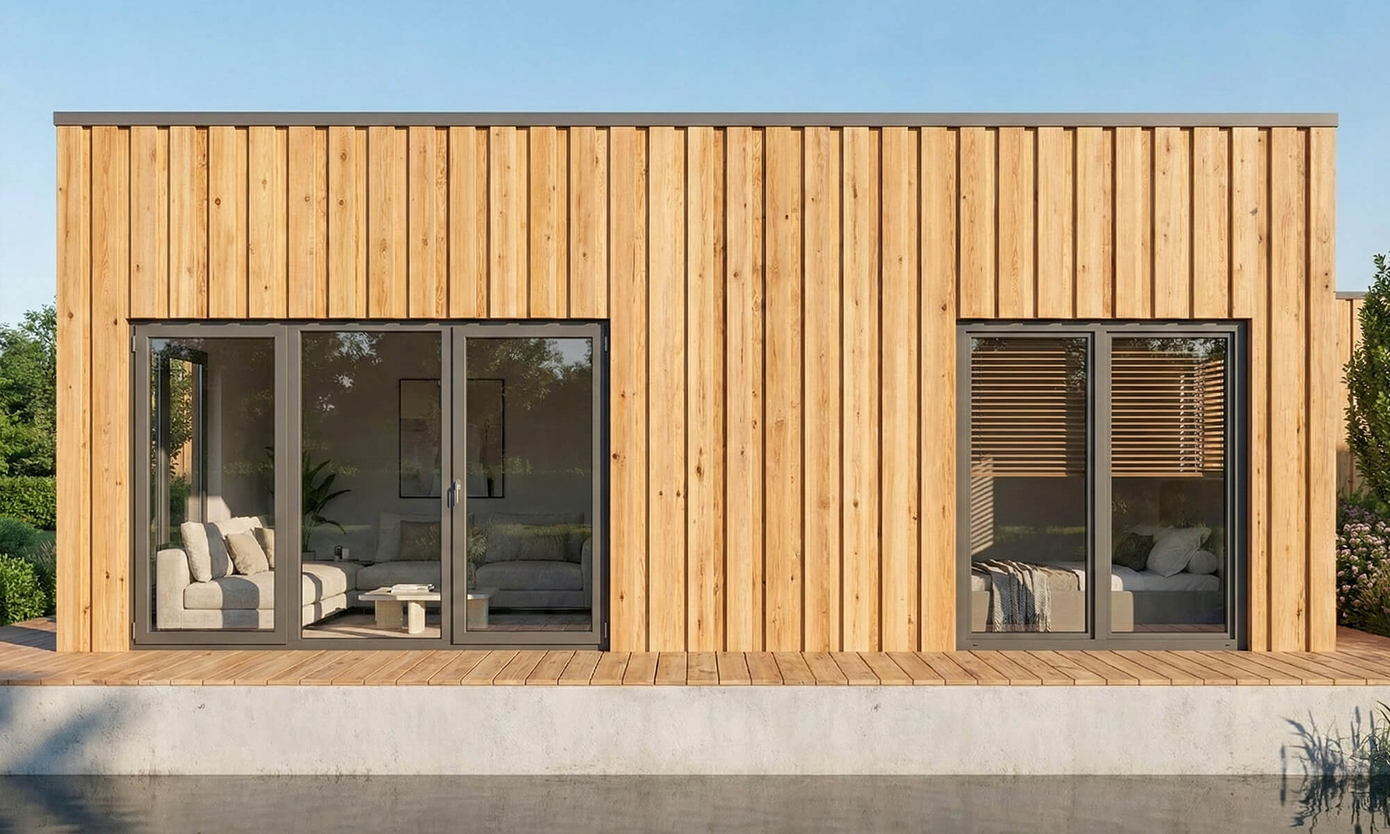 BARLINEK to nowoczesny i przestronny dom do życia i zarabiania: 34 m² (7,5 × 5 m), 2 sypialnie, 1 łazienka. Sprawdza się w najmie dla par, rodzin 2+1/2+2 i pod „workation”, bo całoroczny standard pozwala sprzedawać nie tylko lato, ale też weekendy i sezon niski. Płaski dach i duże przeszklenia nadają mu charakter premium, co pozwala na uzyskiwanie wyższych stawek dobowych.