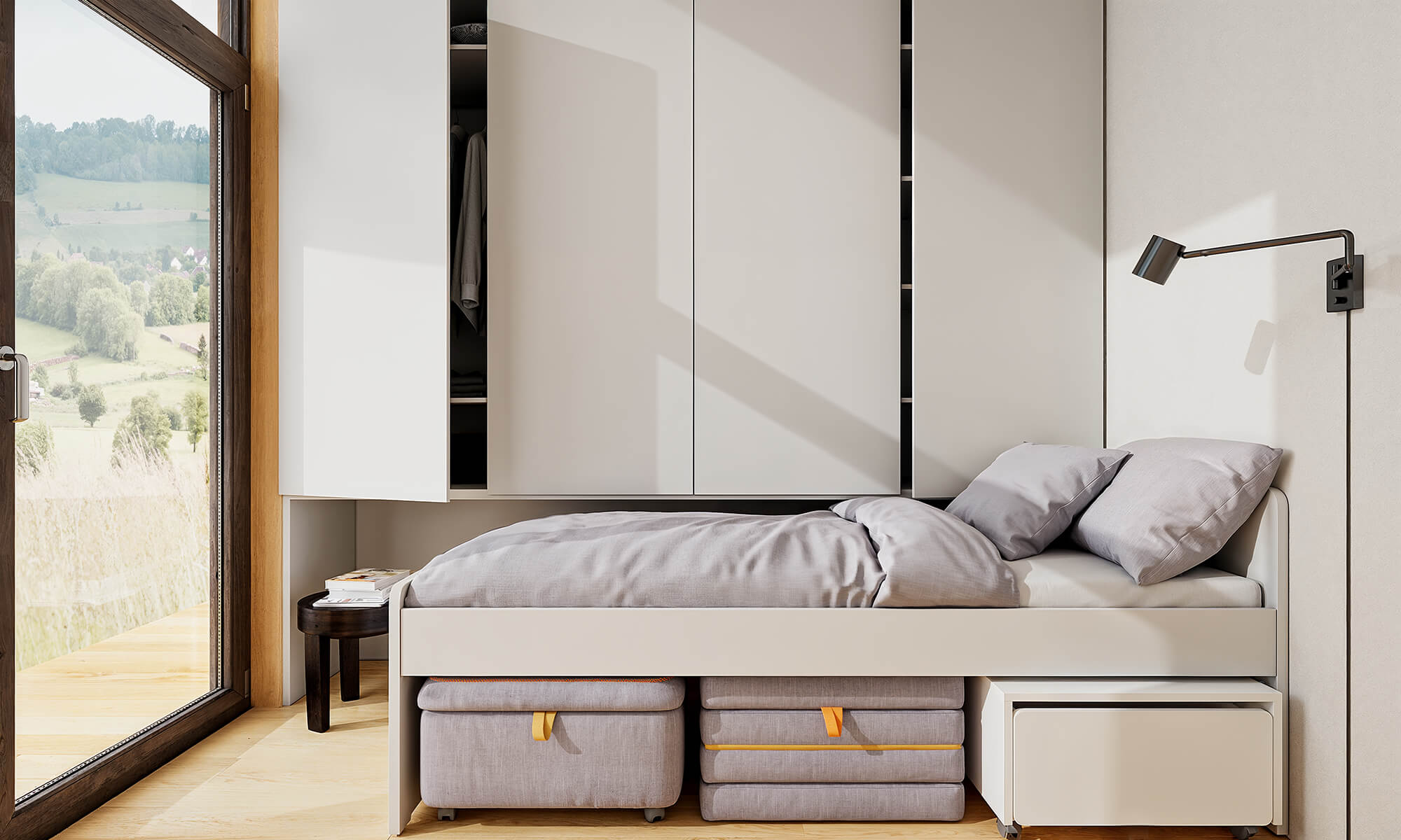 Inteligentne rozwiązania przestrzenne - 43 m², ale pomieści wszystko czego potrzebujesz: 4 pełnowartościowe miejsca do spania plus salon z kuchnią i łazienkę z prysznicem. To idealny ekonomiczny dom dla rodziny lub doskonały wybór na wynajem.