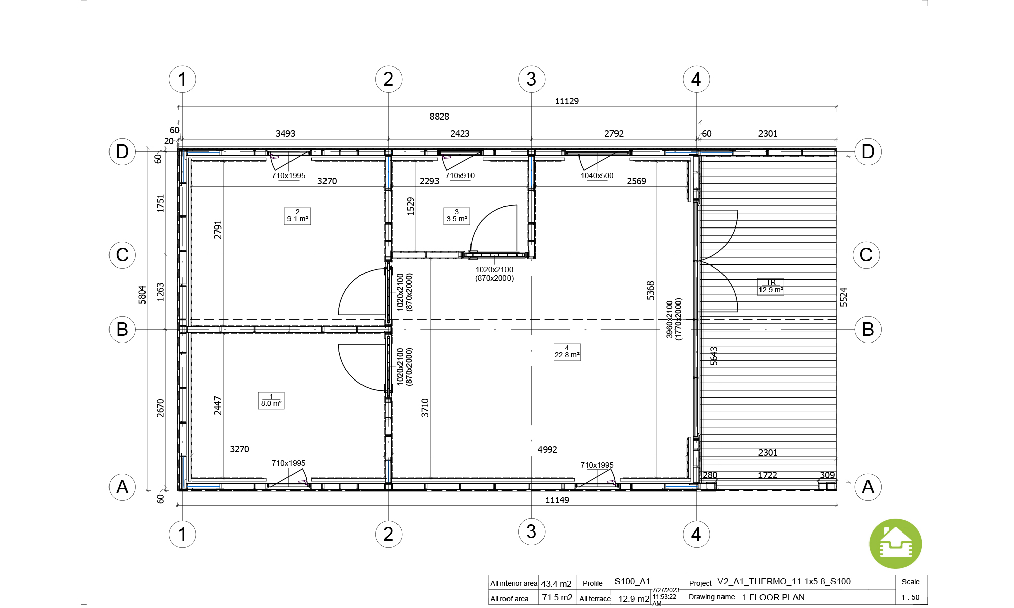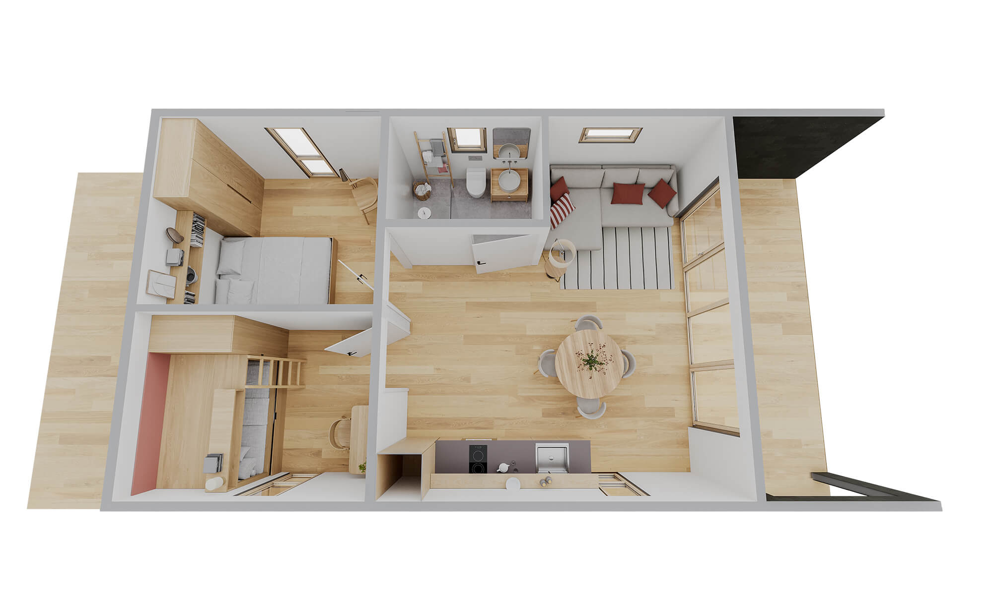 Jaracz V2_A2 to wyjątkowy drewniany dom, który łączy praktyczny design z ekologicznym podejściem. Powierzchnia użytkowa wynosi prawie 44 m², a dodatkowe 13 m² w pełni zadaszonego tarasu pozwala cieszyć się urokami natury niezależnie od pogody. Ten model doskonale sprawdzi się zarówno jako domek letniskowy, jak i zdecydowanie tańsza alternatywa dla mieszkania w mieście.