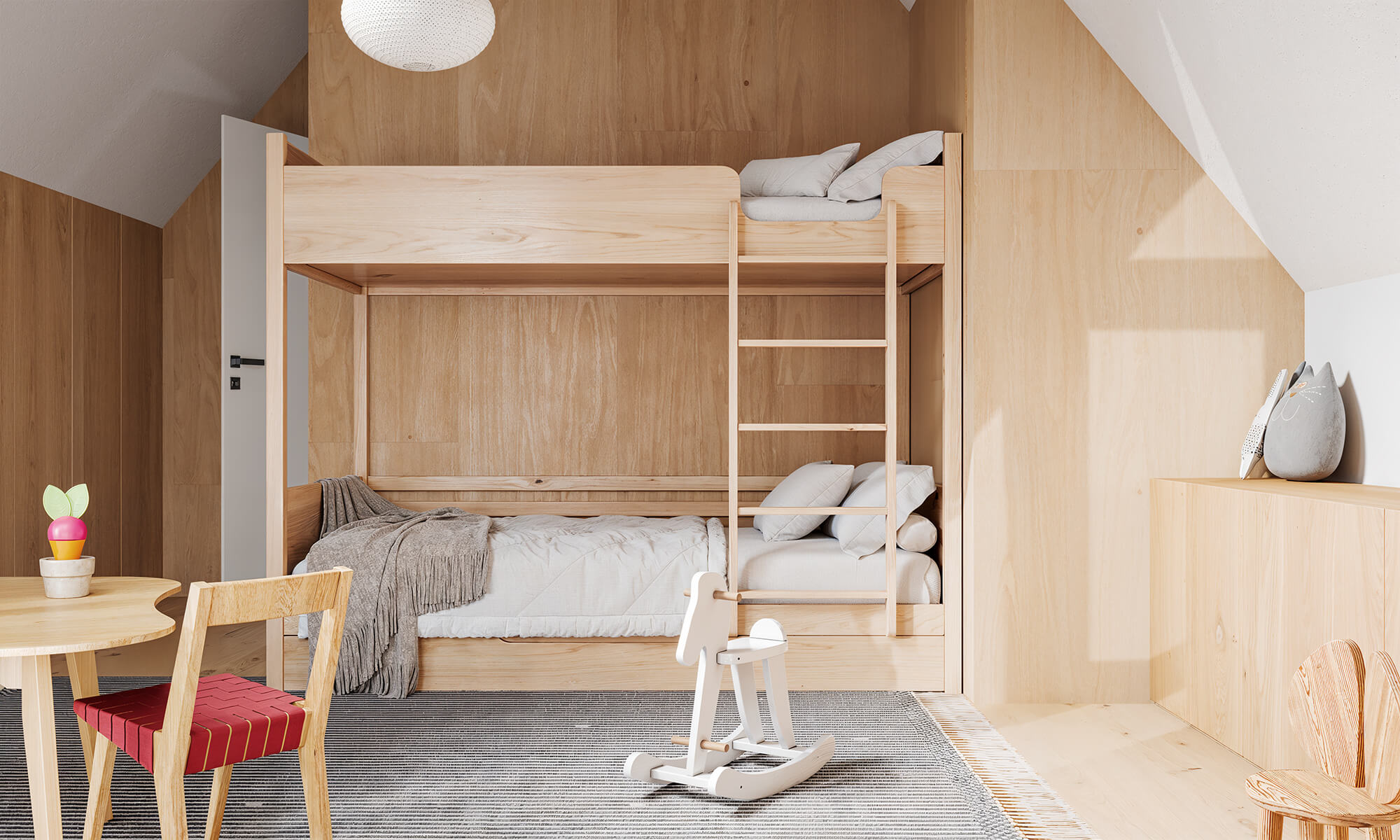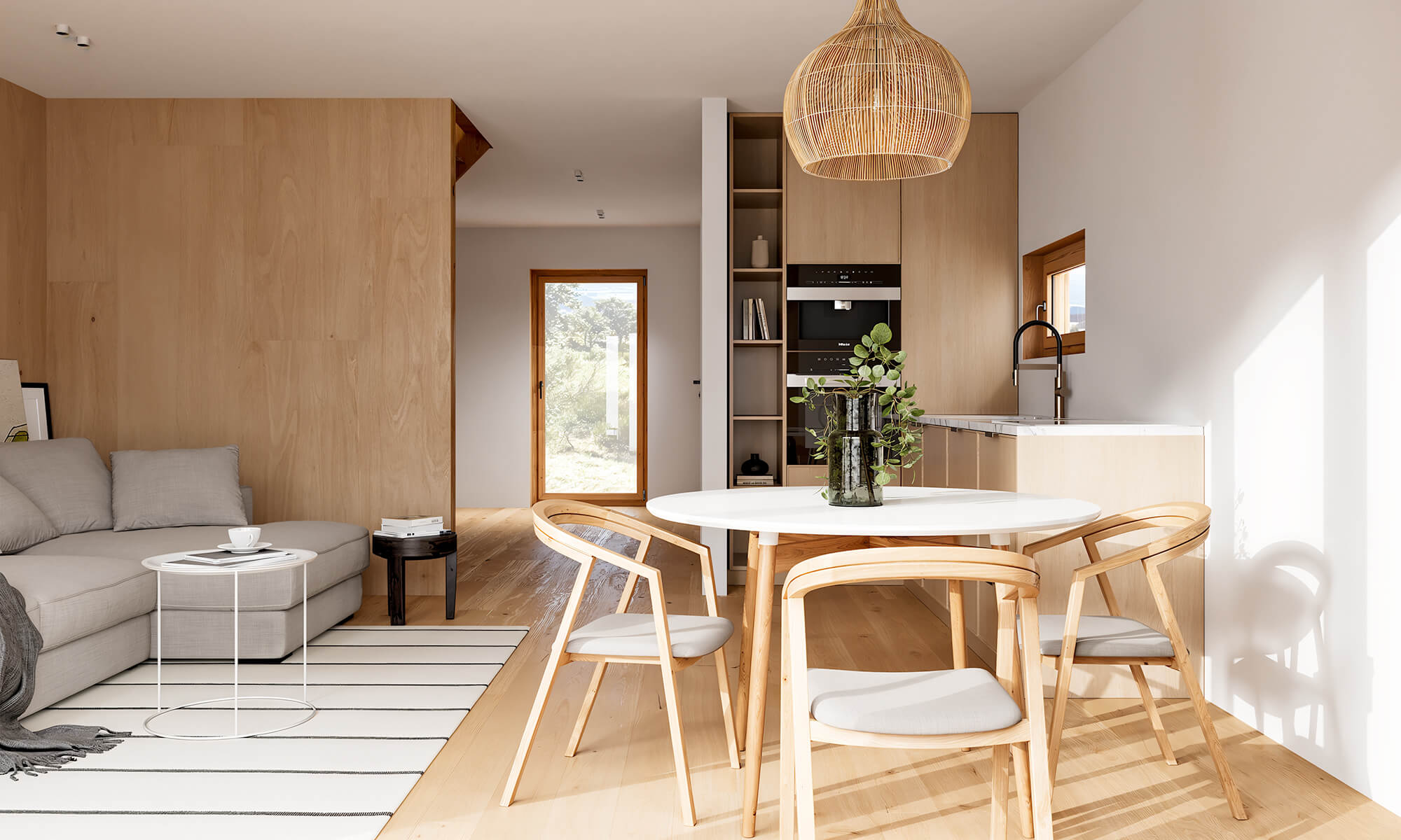 Dom powstaje z fabrycznie przygotowanych modułowych elementów, co znacząco przyspiesza montaż i eliminuje konieczność użycia ciężkiego sprzętu – to oszczędność czasu i kosztów budowy.