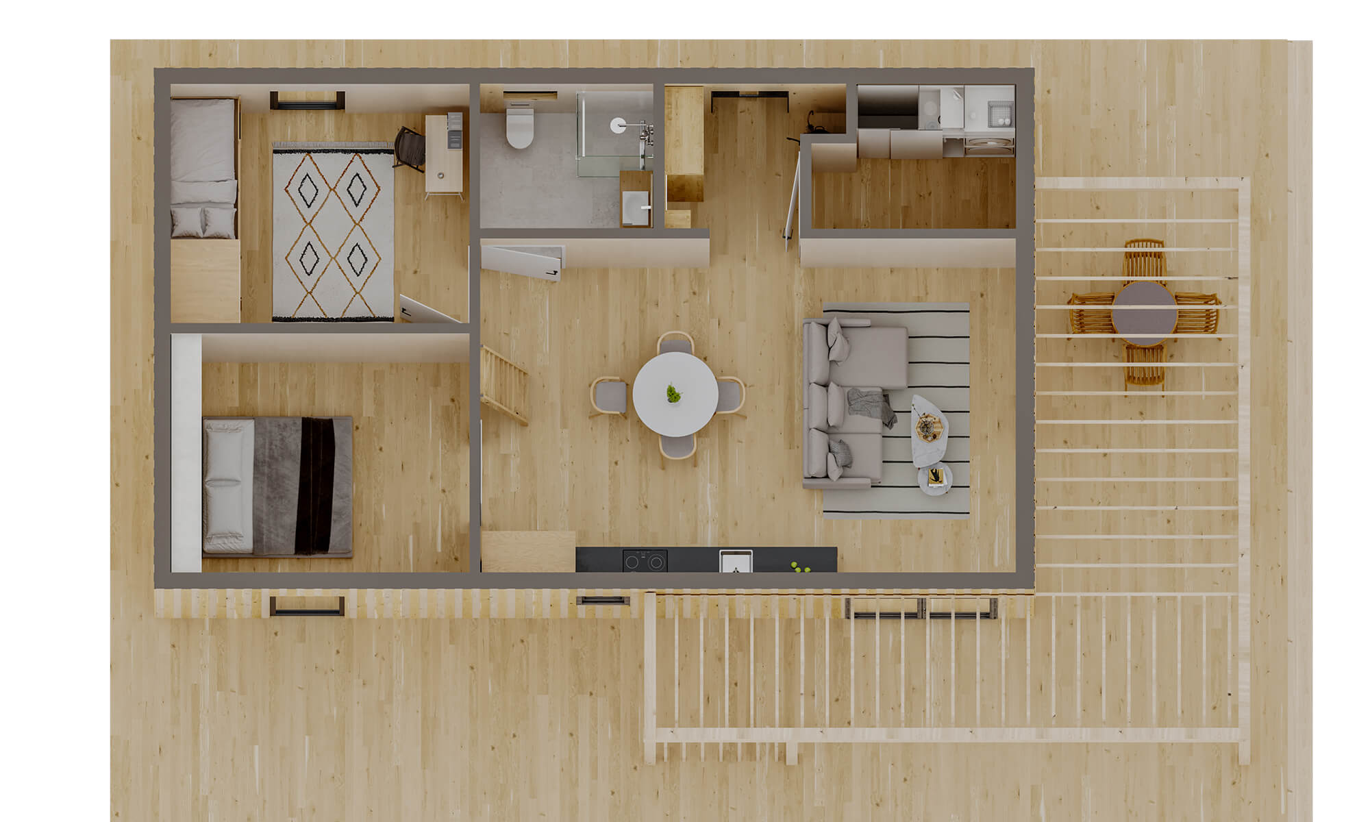 Model Jantar V4_A1 to nowoczesny drewniany dom o powierzchni użytkowej 91 m², który łączy w sobie praktyczność, komfort i elegancję. Idealny zarówno jako letniskowy azyl, jak i tańsza alternatywa dla mieszkania w bloku. Dzięki przemyślanemu projektowi i zastosowaniu najwyższej jakości materiałów, dom spełnia oczekiwania najbardziej wymagających użytkowników.