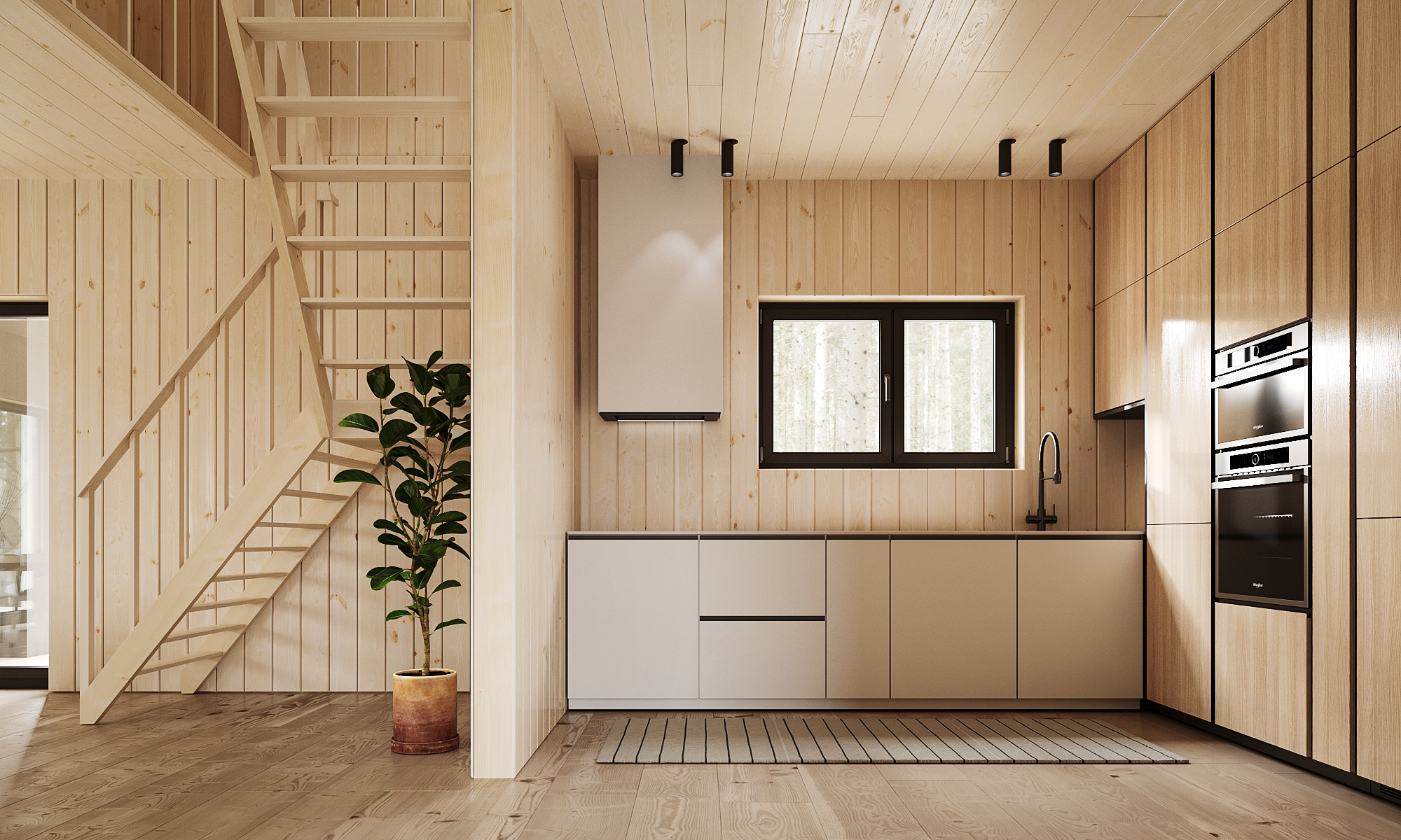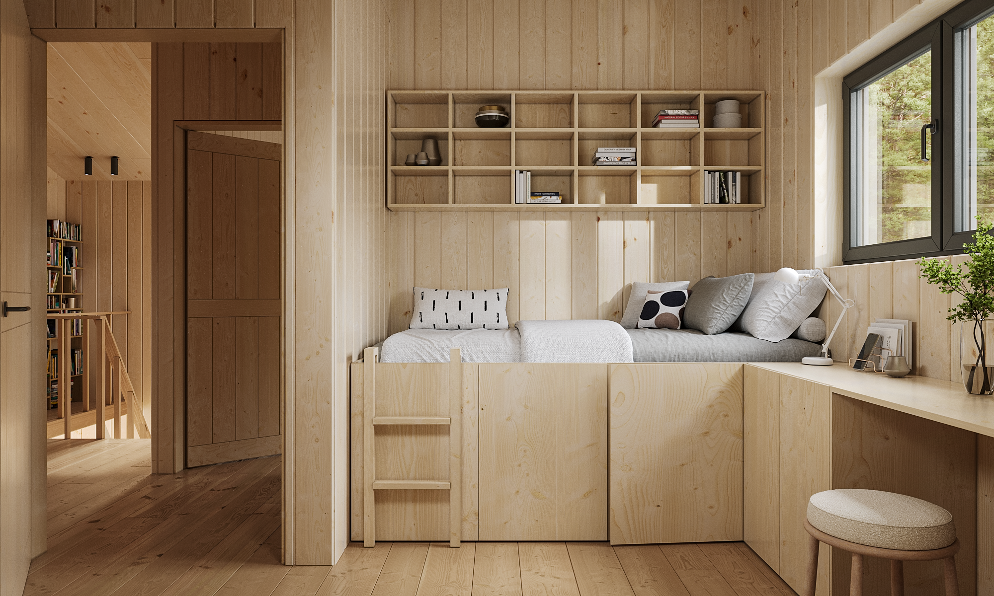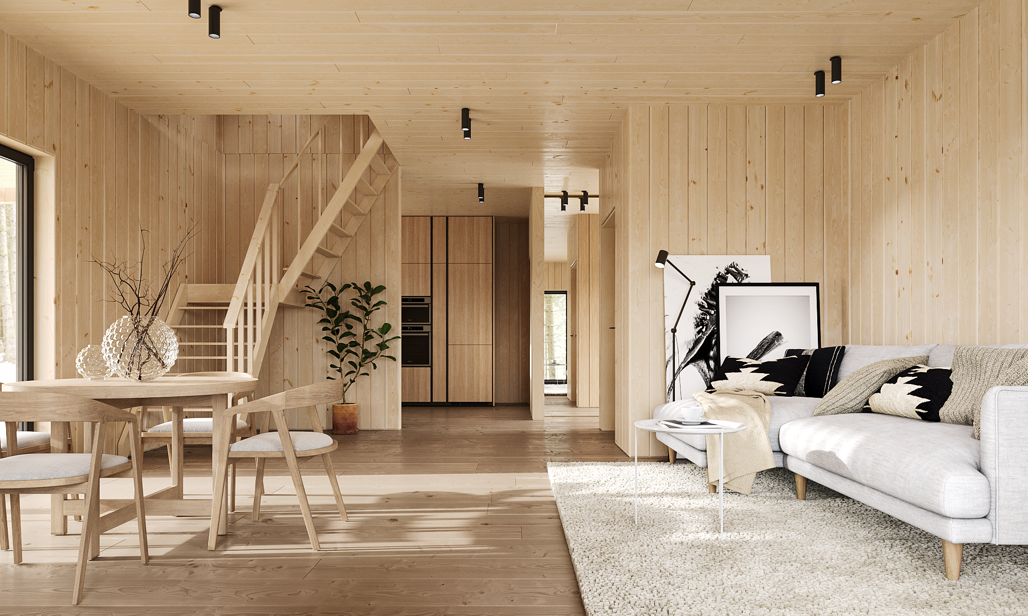 Dom powstaje z prefabrykowanych elementów, co zapewnia szybki montaż – z pełnym wykończeniem wnętrz nawet w 4–5 tygodni.