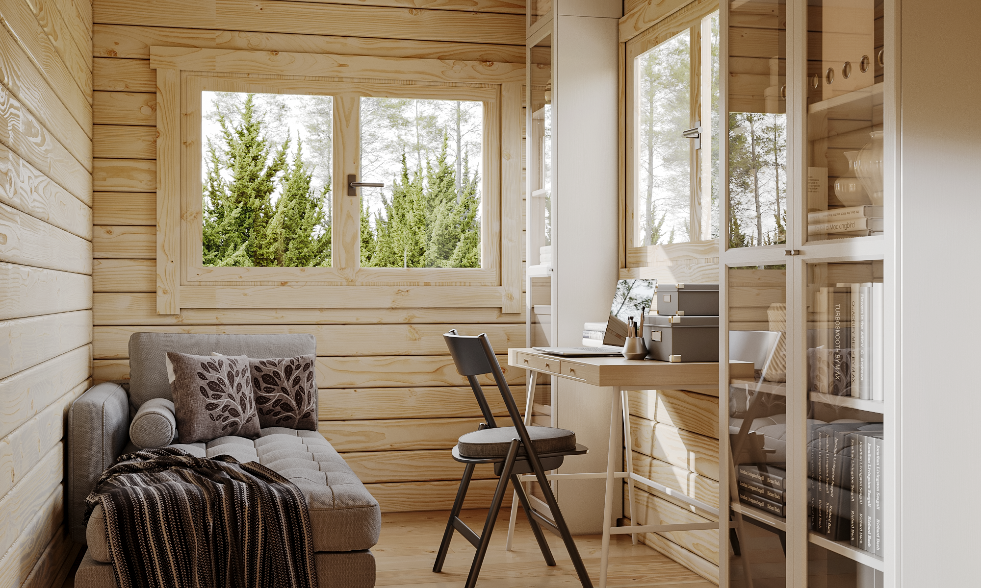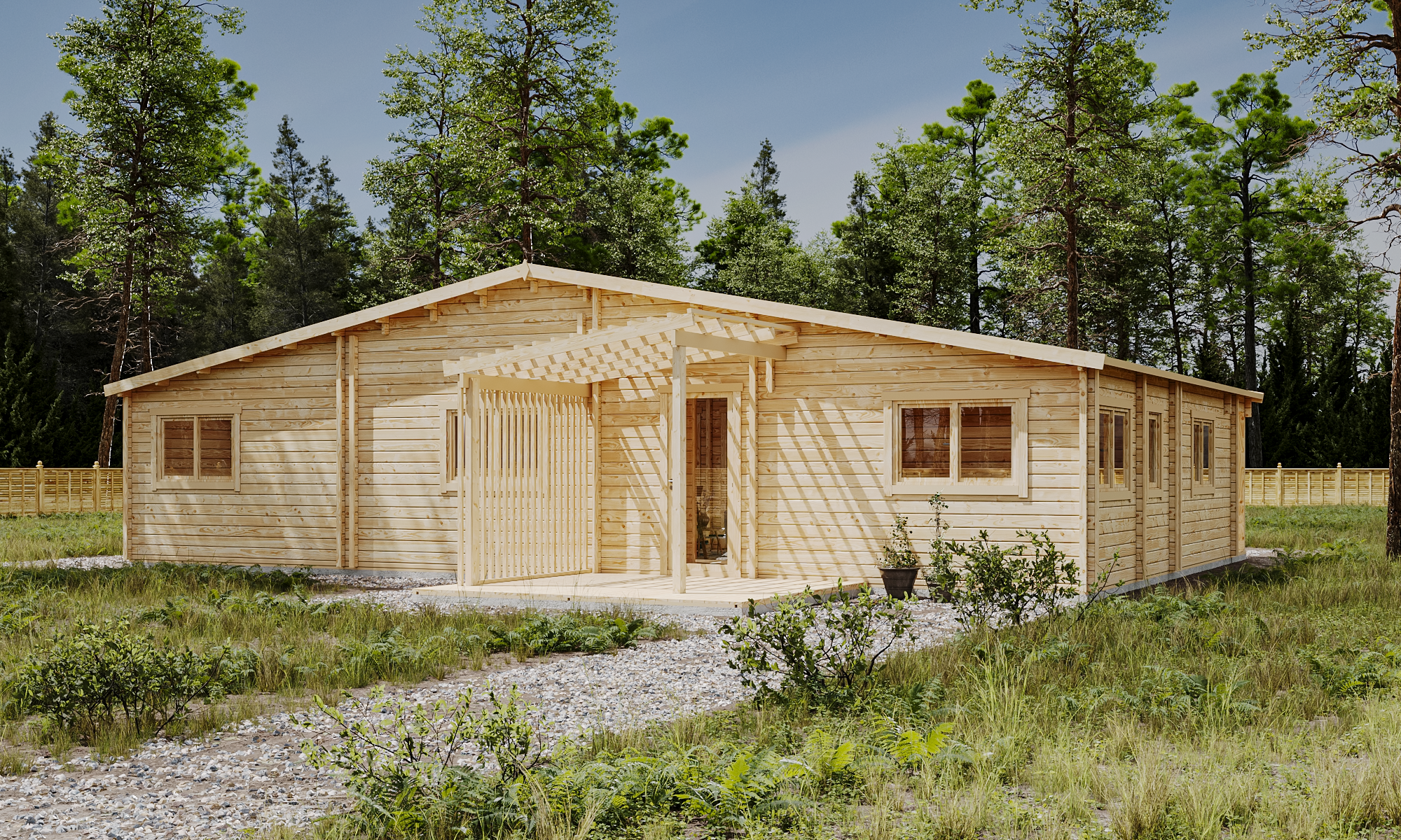 Bardzo przestrzenny, światły (całkowicie zaszklone drzwi), świetnie splanowany domek letniskowy 119 m² wpełni przystosowany dla potrzeb każdej rodziny. W tym ekologicznym domku są urządzone nawet pięc oddzielnych pomieszczeń (pokój dzienny, dwie sypialnie, biuro oraz duża łazienka). W sypialniach są urzadzone duże garderoby. Domek jest splanowany tak, że można wmieścić przedpokój oraz niemałą kuchnie. Domek letniskowy ma duży taras. Ten projekt może być stosowany jako kemping oraz ośrodek rekreacyjny. Domek wykonany z prostej konstrukcji, dlatego łatwo się go montuje. Więcej modeli znajdziesz w kategorii Domy letniskowe.