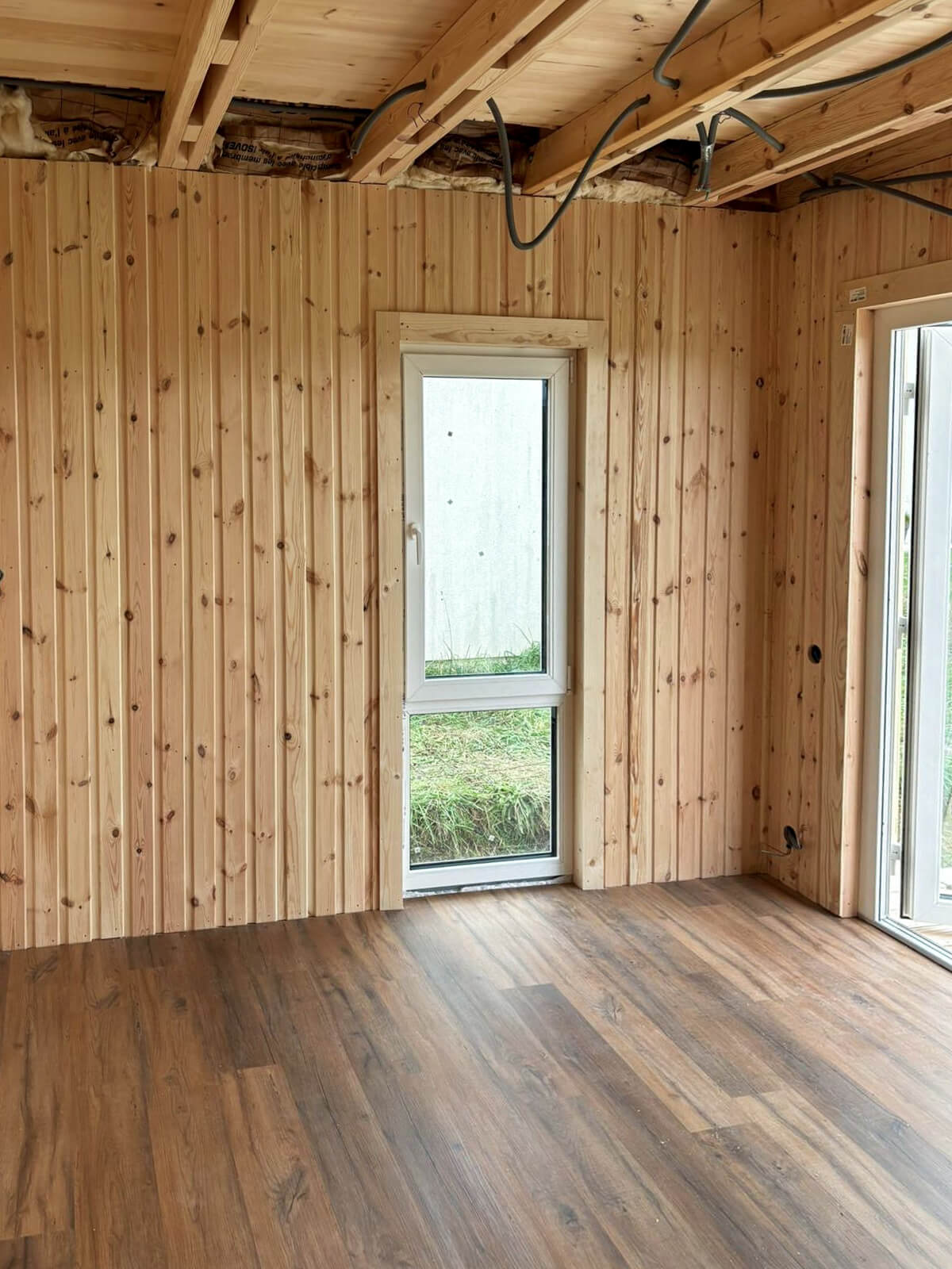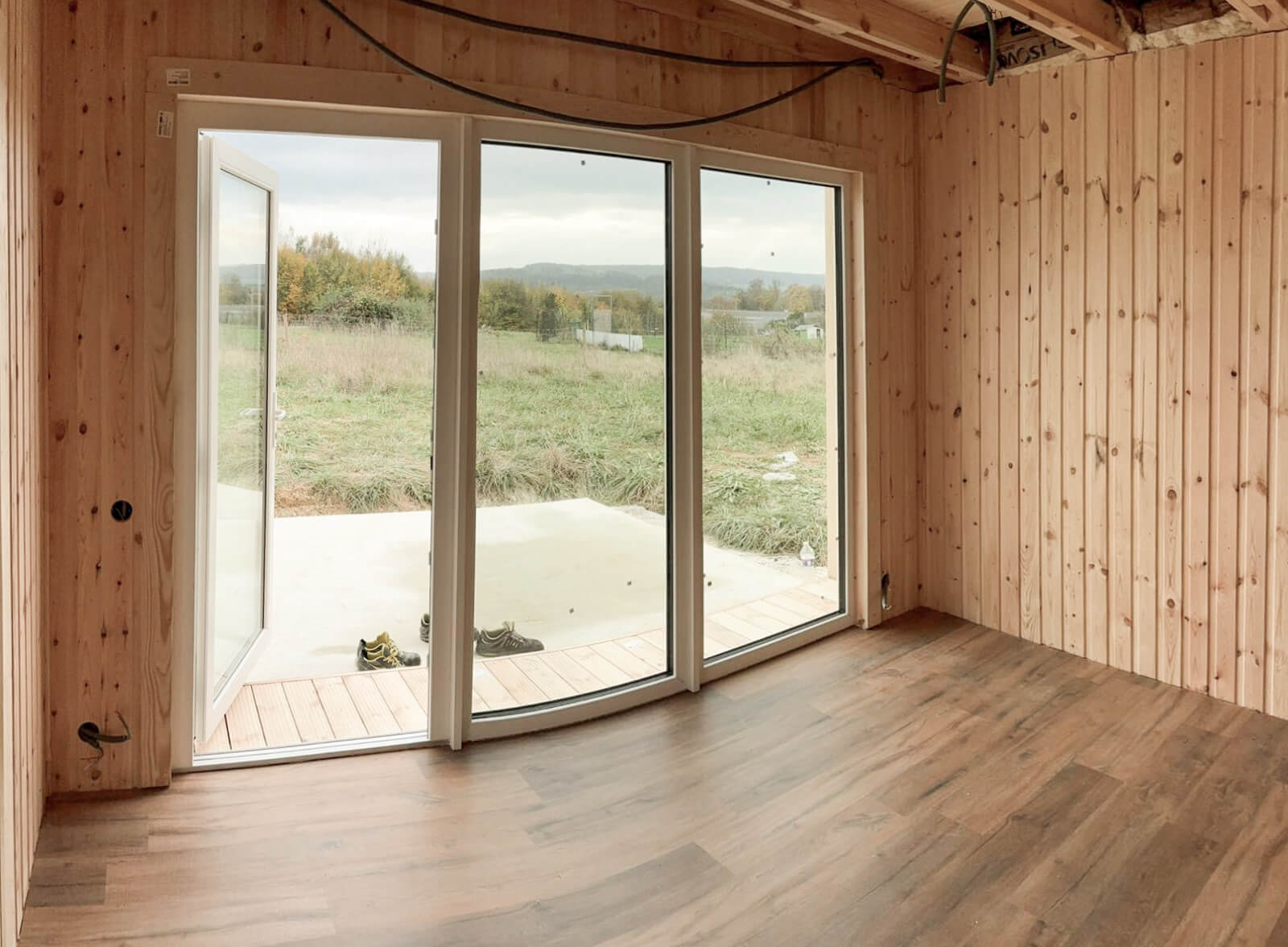 Okna i drzwi: Do wyboru drewniana lub PVC stolarka z trzema szybami, zapewniająca lepszą termoizolację.