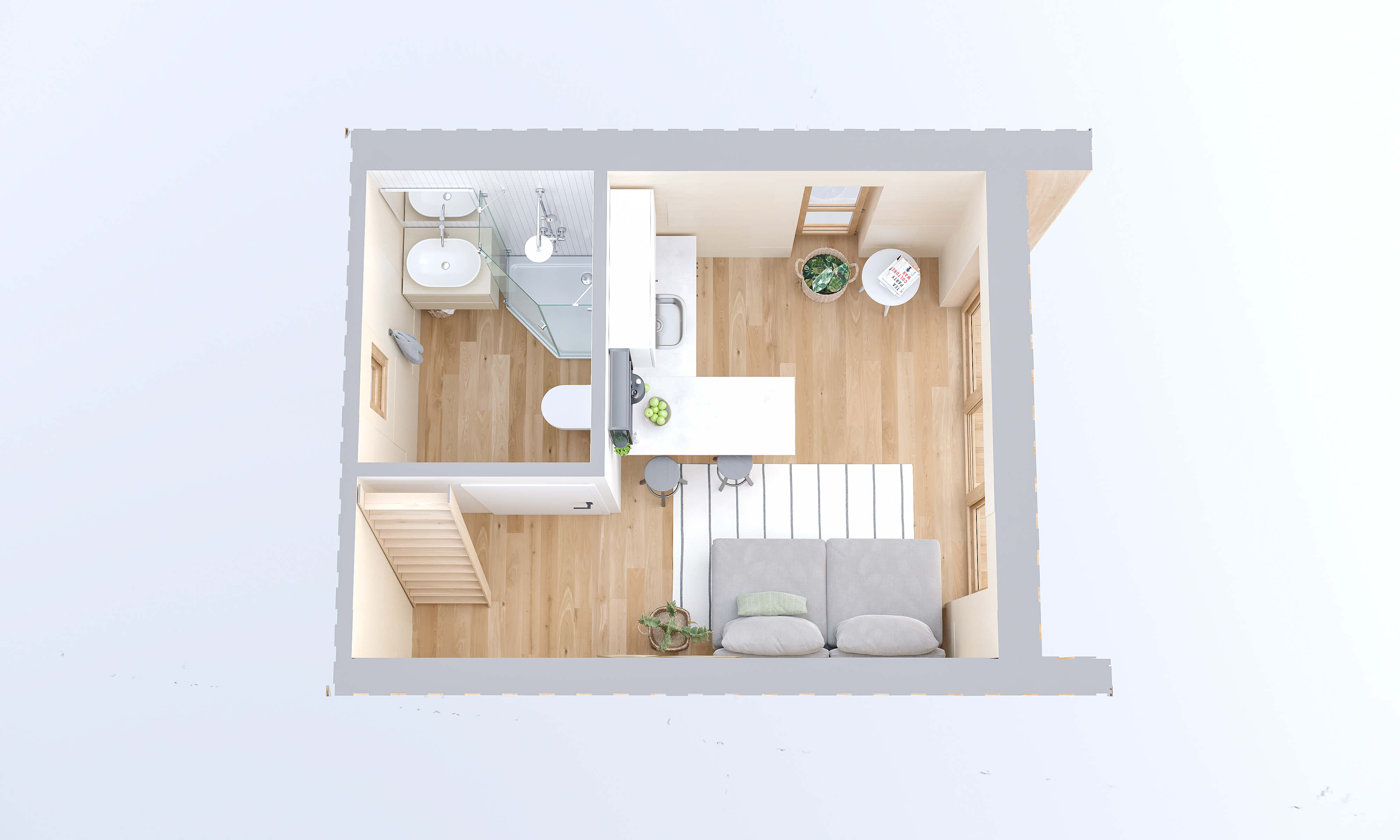 Powierzchnia użytkowa 30 m²: Doskonały układ obejmuje przestronny, jasny salon, pomieszczenie na łazienkę i dużą sypialnię na piętrze.