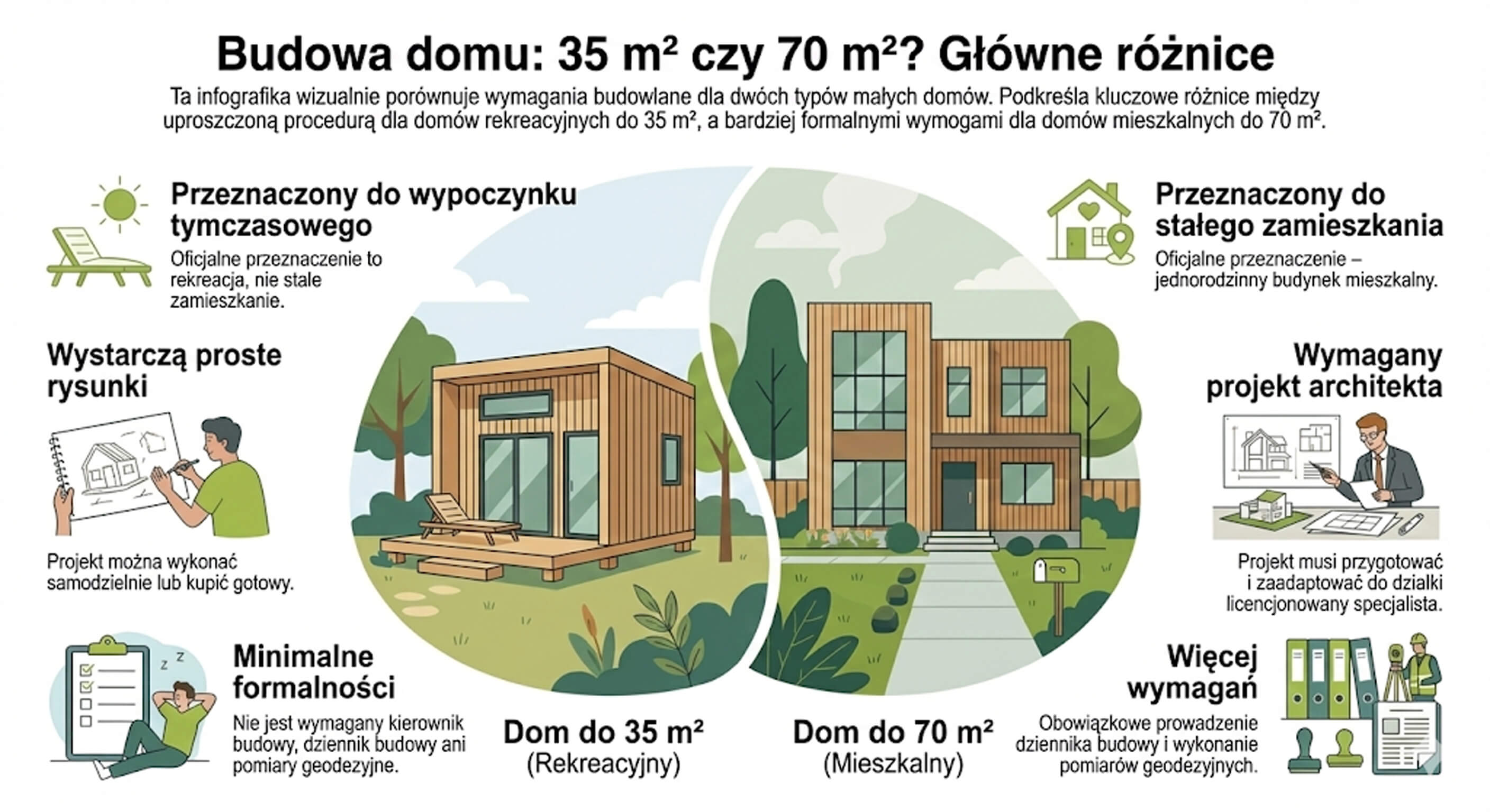 Dom do 35 m² vs dom do 70 m² w Polsce – kluczowe różnice (zgłoszenie, formalności, wymagania)