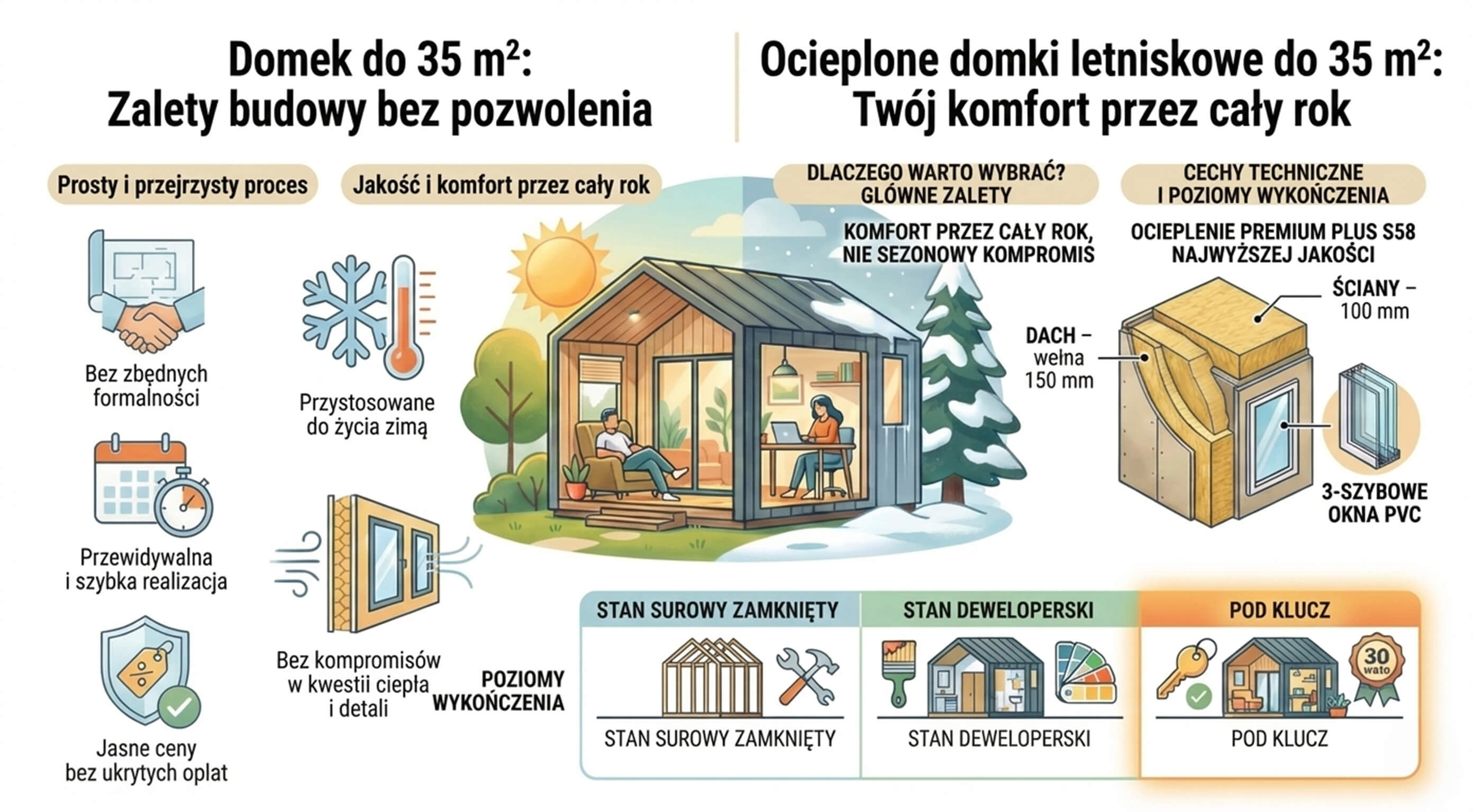 Szukasz rozwiązania, które daje realny komfort, a nie „sezonowy kompromis”? Domki rekreacyjne ocieplone do 35 m² to praktyczne domki bez pozwolenia, które świetnie sprawdzają się jako domek na działkę, domek całoroczny do 35 m², a także jako dodatkowa przestrzeń przy domu.