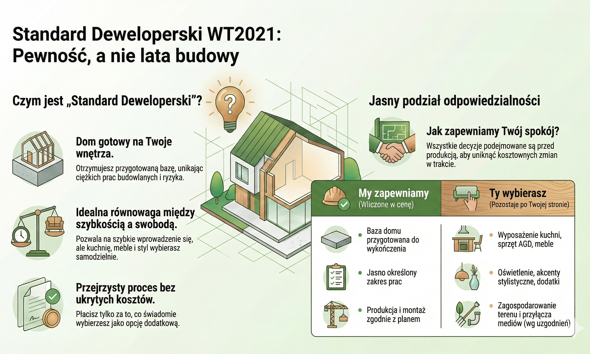 EkoArchitektura, prowadzimy sprzedaż tak, abyś od pierwszej rozmowy miał(a) jasność: co dokładnie dostajesz, co jest w cenie i co zostaje po Twojej stronie. Ten standard wybierają osoby, które chcą domu prawie gotowego do zamieszkania, ale bez przepłacania za decyzje, które wolą dobrać samodzielnie (kuchnia, meble, styl).