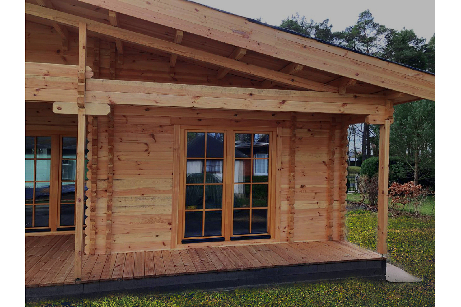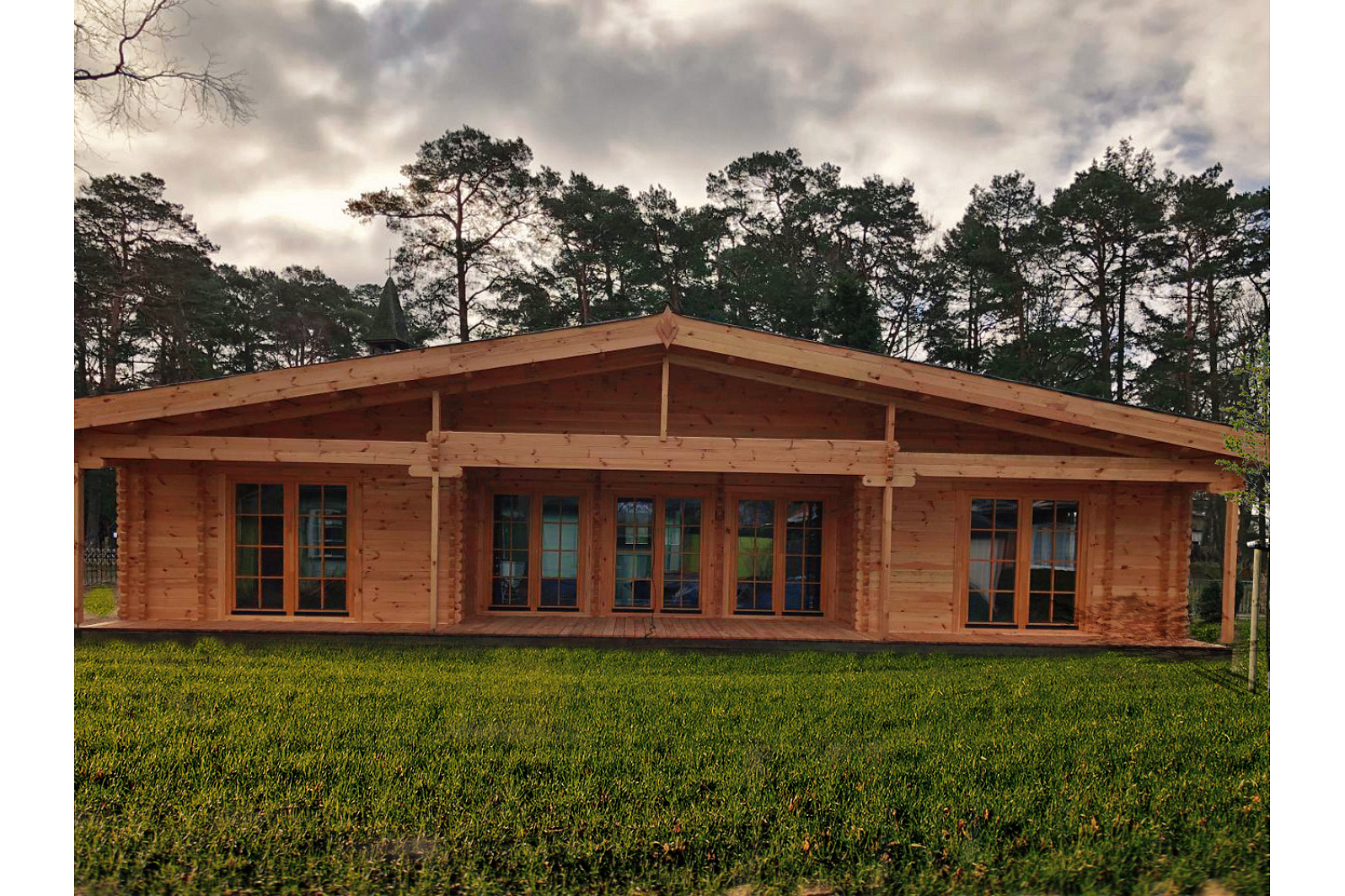 Bardzo przestrzenny, światły (całkowicie zaszklone drzwi), świetnie splanowany domek letniskowy 119 m² wpełni przystosowany dla potrzeb każdej rodziny. W tym ekologicznym domku są urządzone nawet pięc oddzielnych pomieszczeń (pokój dzienny, dwie sypialnie, biuro oraz duża łazienka). W sypialniach są urzadzone duże garderoby. Domek jest splanowany tak, że można wmieścić przedpokój oraz niemałą kuchnie. Domek letniskowy ma duży taras. Ten projekt może być stosowany jako kemping oraz ośrodek rekreacyjny. Domek wykonany z prostej konstrukcji, dlatego łatwo się go montuje.