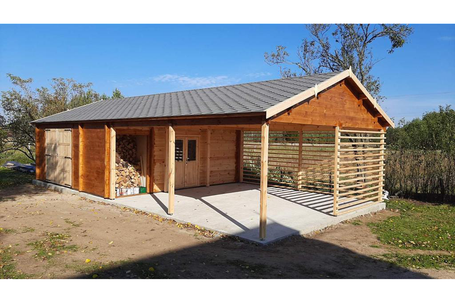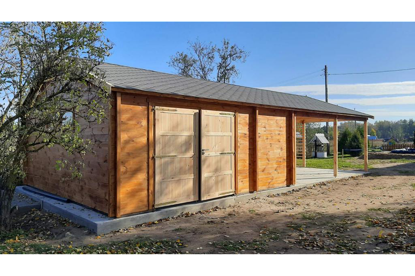 Ekologiczny garaż 71 m² z szopą jest idealny dla tych, którzy szukają połączonego rozwiązania dla swoich pojazdów. Boczne drzwi garażowe pozwolą w łatwy i wygodny sposób wejść do wnętrza budynku, a okna na ścianie zapewnią optymalną wydajność świetlną wewnątrz pomieszczeń, z pełnymi drewnianymi drzwiami garażowymi.