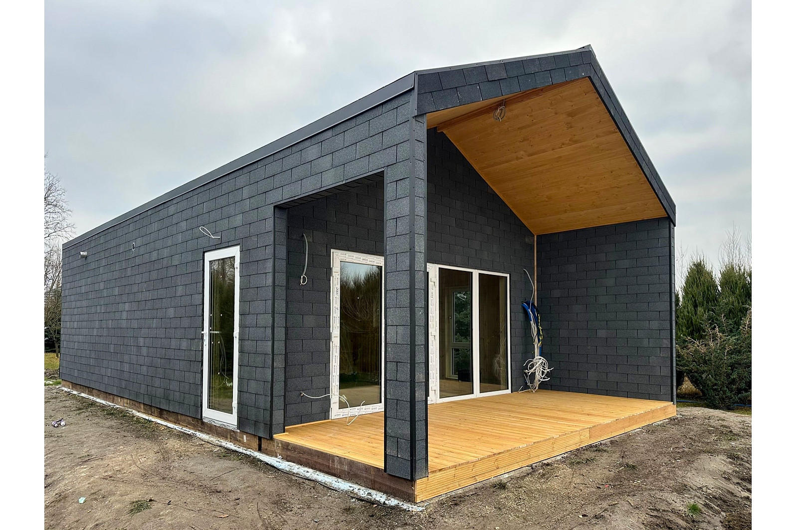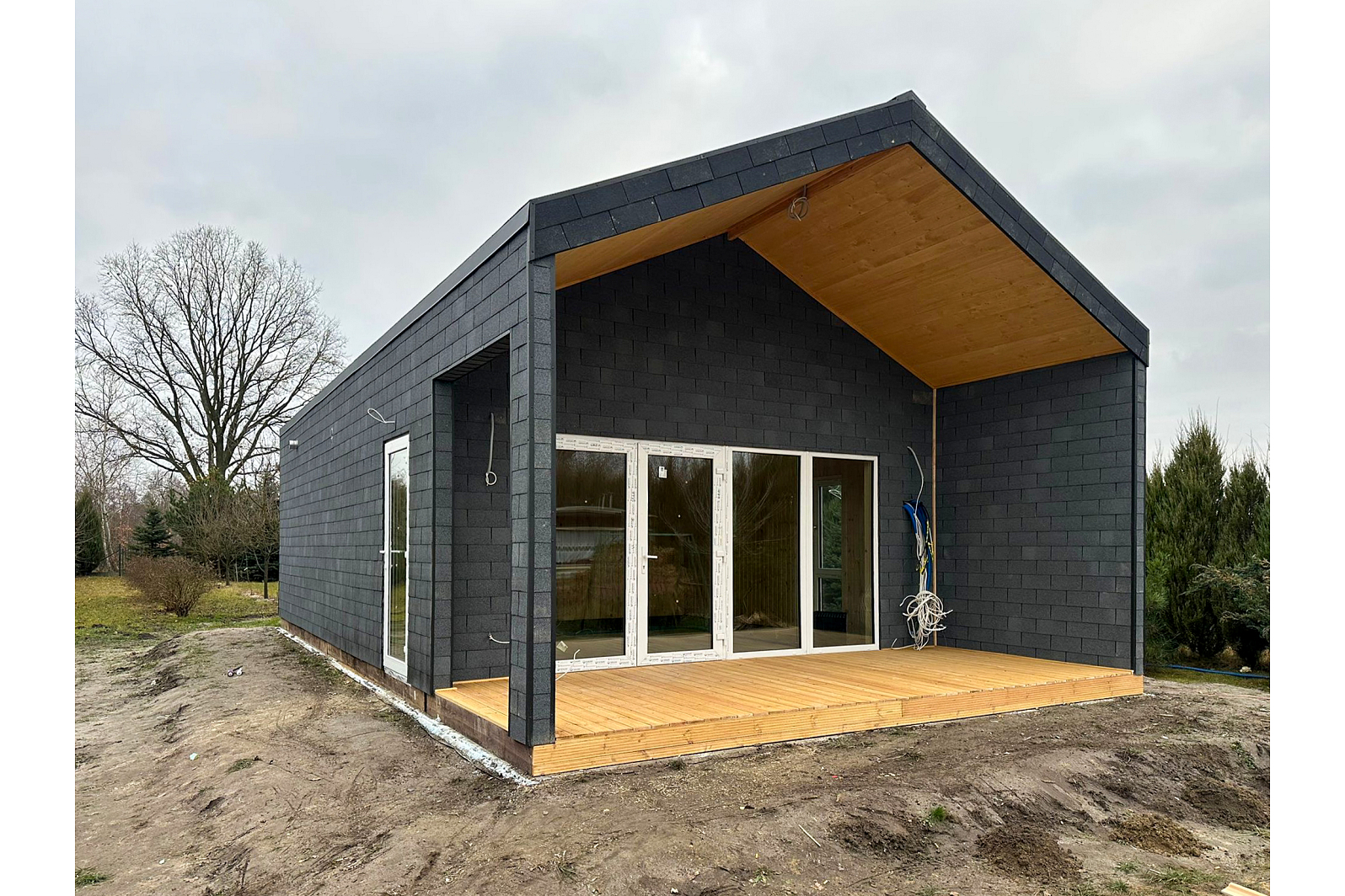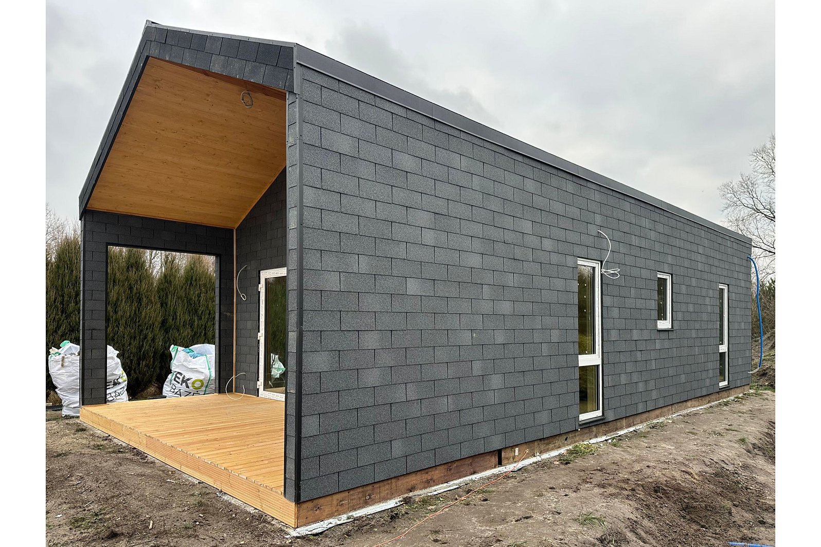 Zobacz galerię, aby poznać wszystkie detale tego domu: przestronne wnętrze, funkcjonalny układ pomieszczeń oraz elegancki taras, który zaprasza do relaksu na świeżym powietrzu. Szczególnie warto zwrócić uwagę na modne wykończenie elewacji gontem bitumicznym – to ciekawa alternatywa dla klasycznego tynku, która zapewnia trwałość i estetyczny wygląd. ✨